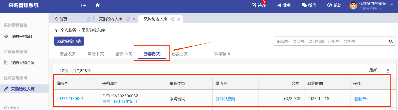 第五步:當(dāng)驗(yàn)收項(xiàng)目通過后,就會(huì)在“已驗(yàn)收”標(biāo)簽下顯示已驗(yàn)收項(xiàng)目信息,如圖所示: