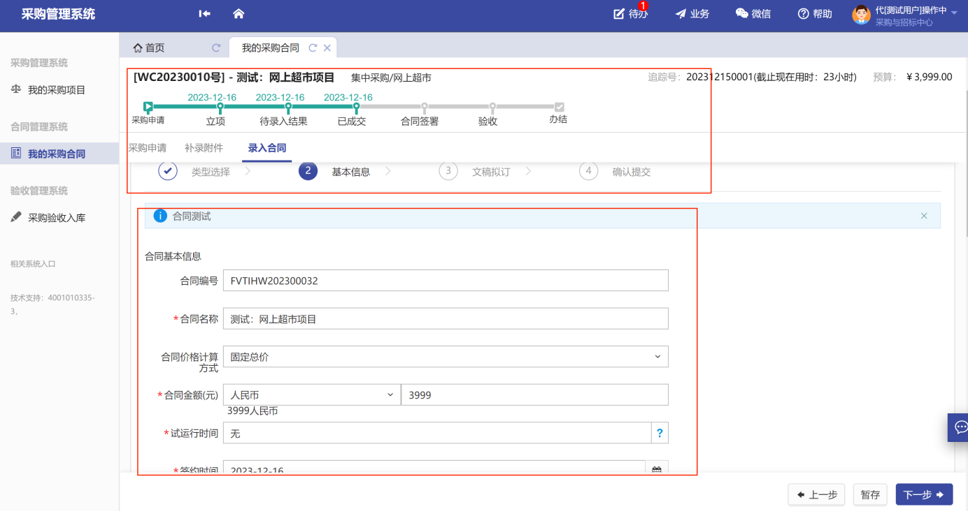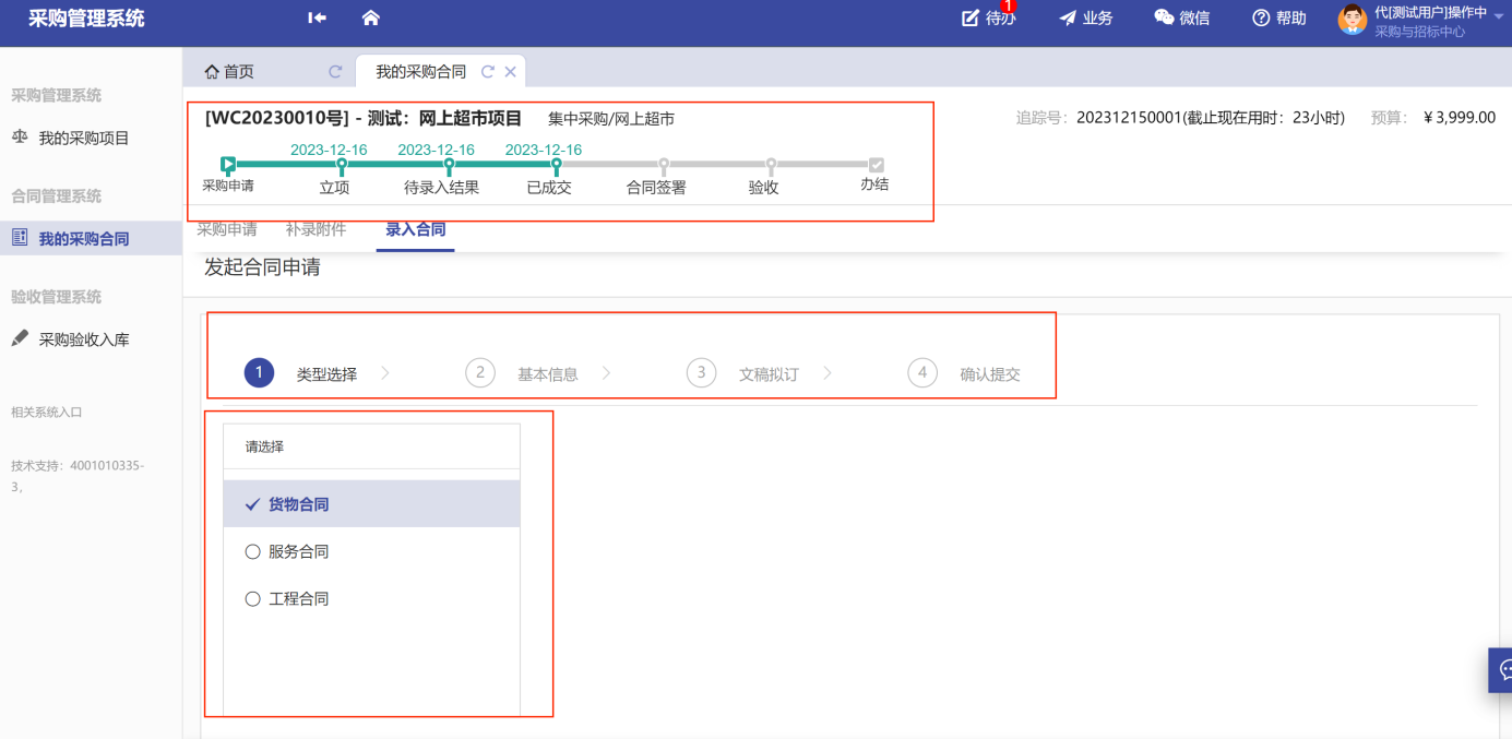 用戶老師根據(jù)自己的采購類型選擇對(duì)應(yīng)合同類別入口,因不同的合同類型,填寫的字段要求稍有不同,用戶老師必須按填寫頁面的提示信息,提交必要信息。