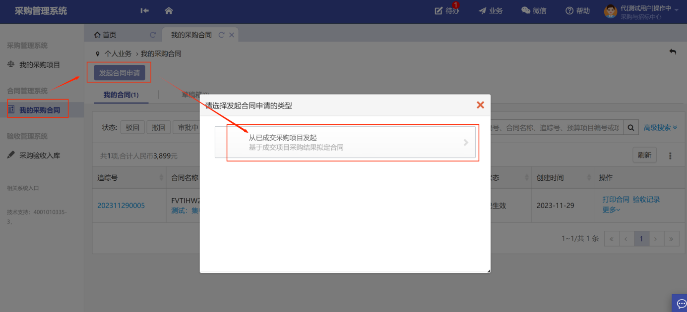 第一步:用戶根據(jù)項(xiàng)目成交信息,在系統(tǒng)頁面,點(diǎn)擊“我的采購合同”-“發(fā)起合同申請(qǐng)”,如圖所示: