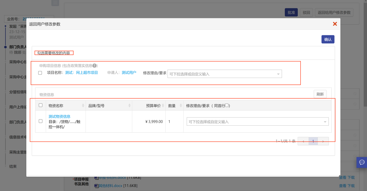 如果在審核過程,如需申請(qǐng)人修改信息,可以點(diǎn)擊“返回用戶修改參數(shù)”,如圖所示: