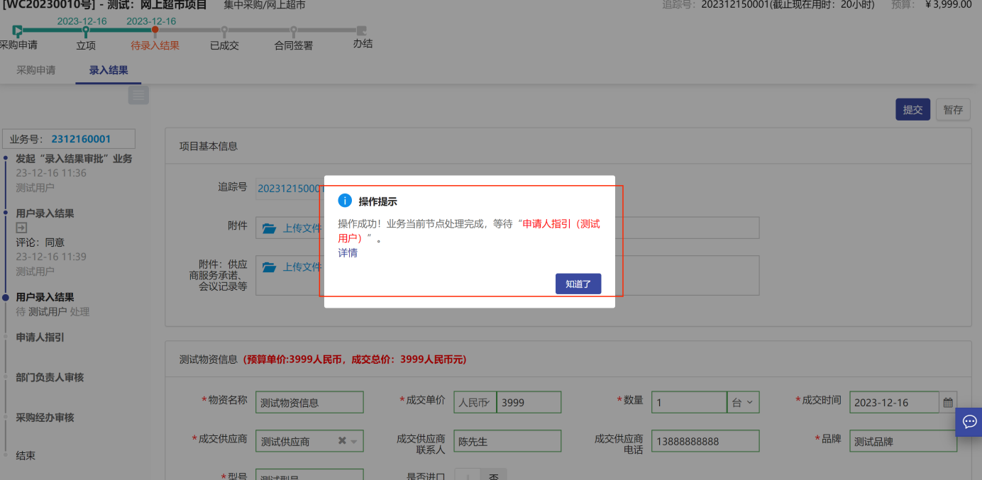 錄入結(jié)果審批后提示: