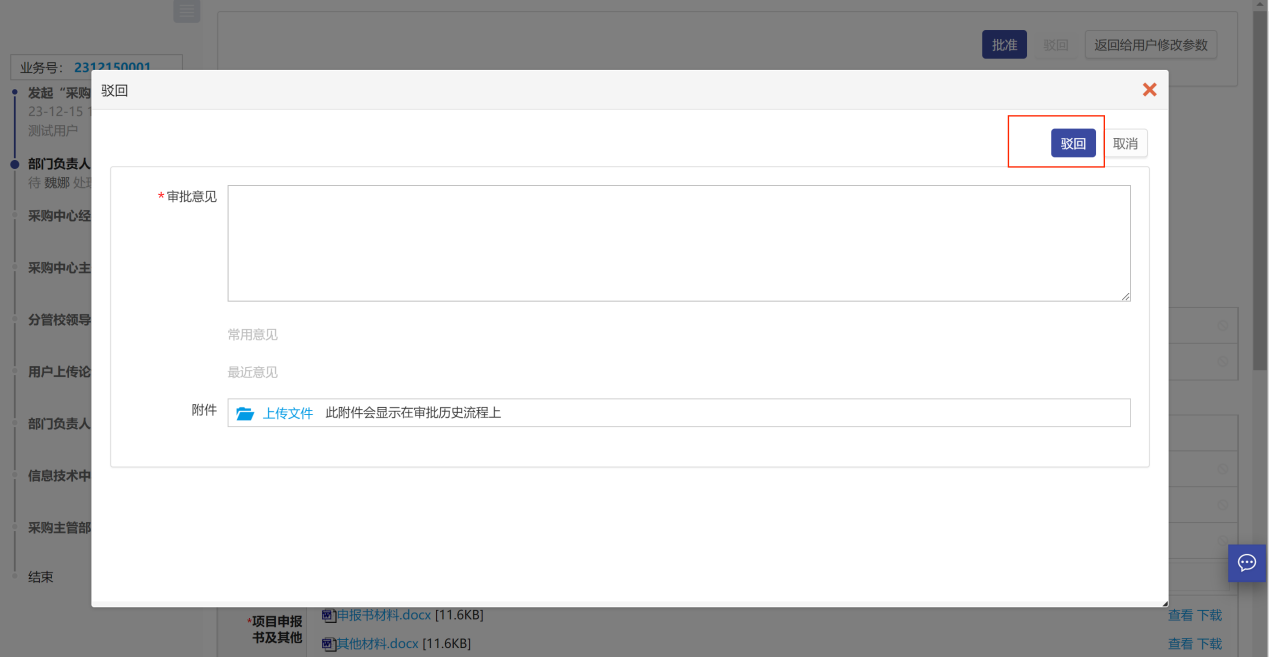 點(diǎn)擊駁回按鈕,填寫審批意見,然后點(diǎn)擊“駁回”,如圖所示: