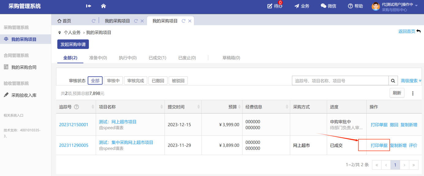采購申請(qǐng)辦理成交后,可以在我的采購項(xiàng)目中,打印申請(qǐng)表,如圖所示: