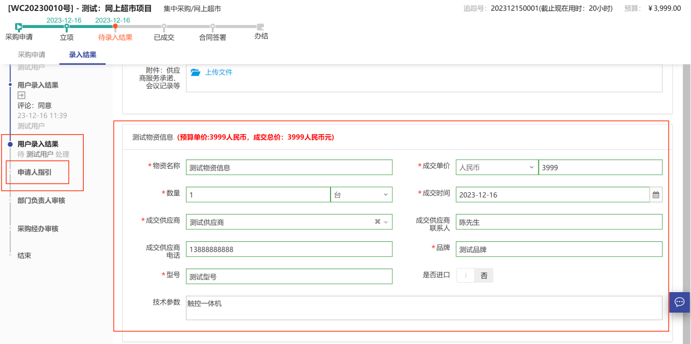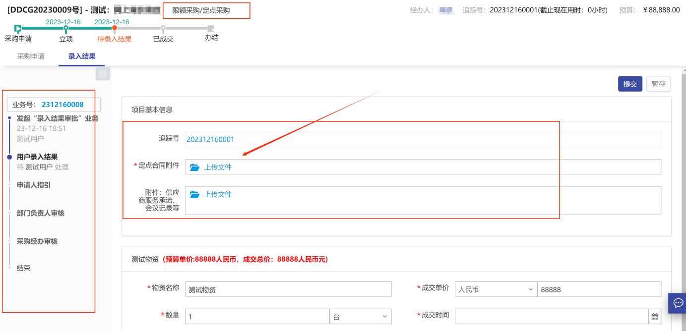 注意:因不同采購類型的錄入結(jié)果頁面所填寫的信息或單據(jù)會(huì)有不同,用戶老師需按實(shí)際情況按提示內(nèi)容填寫。比如【定點(diǎn)采購】的錄入結(jié)果頁面,如圖所示: