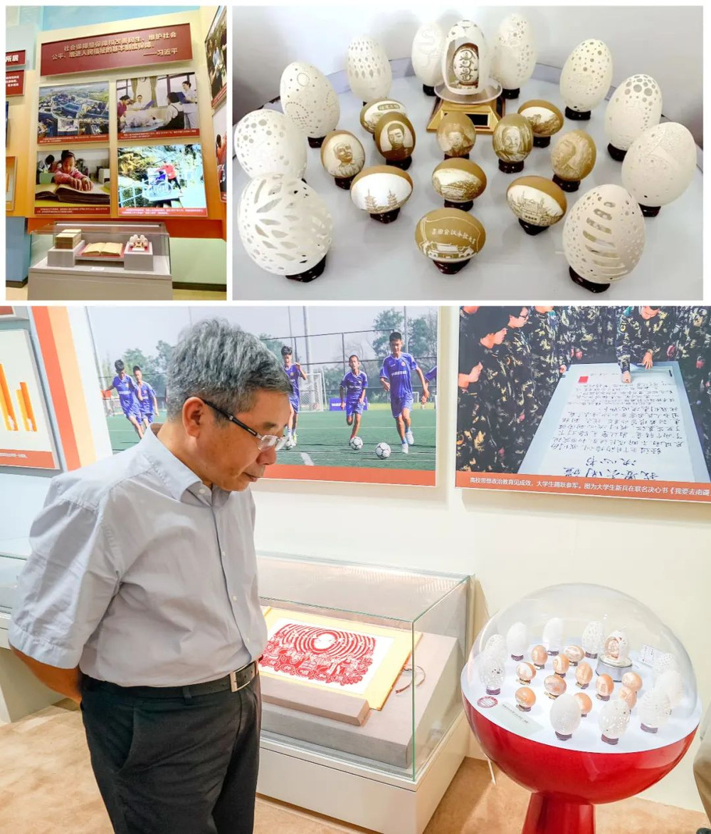 特教學子蛋雕作品入選“奮進新時代”主題成就展(上)、時任教育部部長陳寶生在“砥礪奮進的五年”大型成就展觀看特教學子蛋雕作品(下)