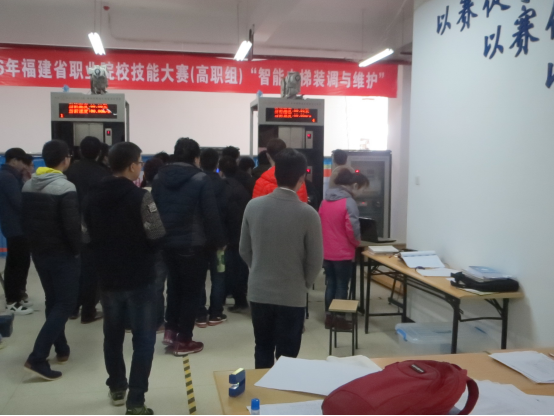 福州大學副教授李少綱老師帶領學生參觀學院實訓中心的電梯安裝和國賽電梯設備及其運行。在參觀過程中,由福建迅達電梯公司的安裝人員介紹電梯的結構和安裝,學院電梯工程技術專業(yè)的學生操作展示國賽電梯設備的單電梯運行和兩臺群控電梯運行。
