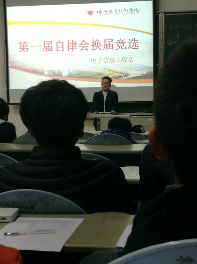 2016年12月2日晚七點,電子信息工程系第一屆自律會換屆大會在2號樓322順利召開。輔導員王莉和自律會主席呂東曉及各個部門的部長出席了本次大會。