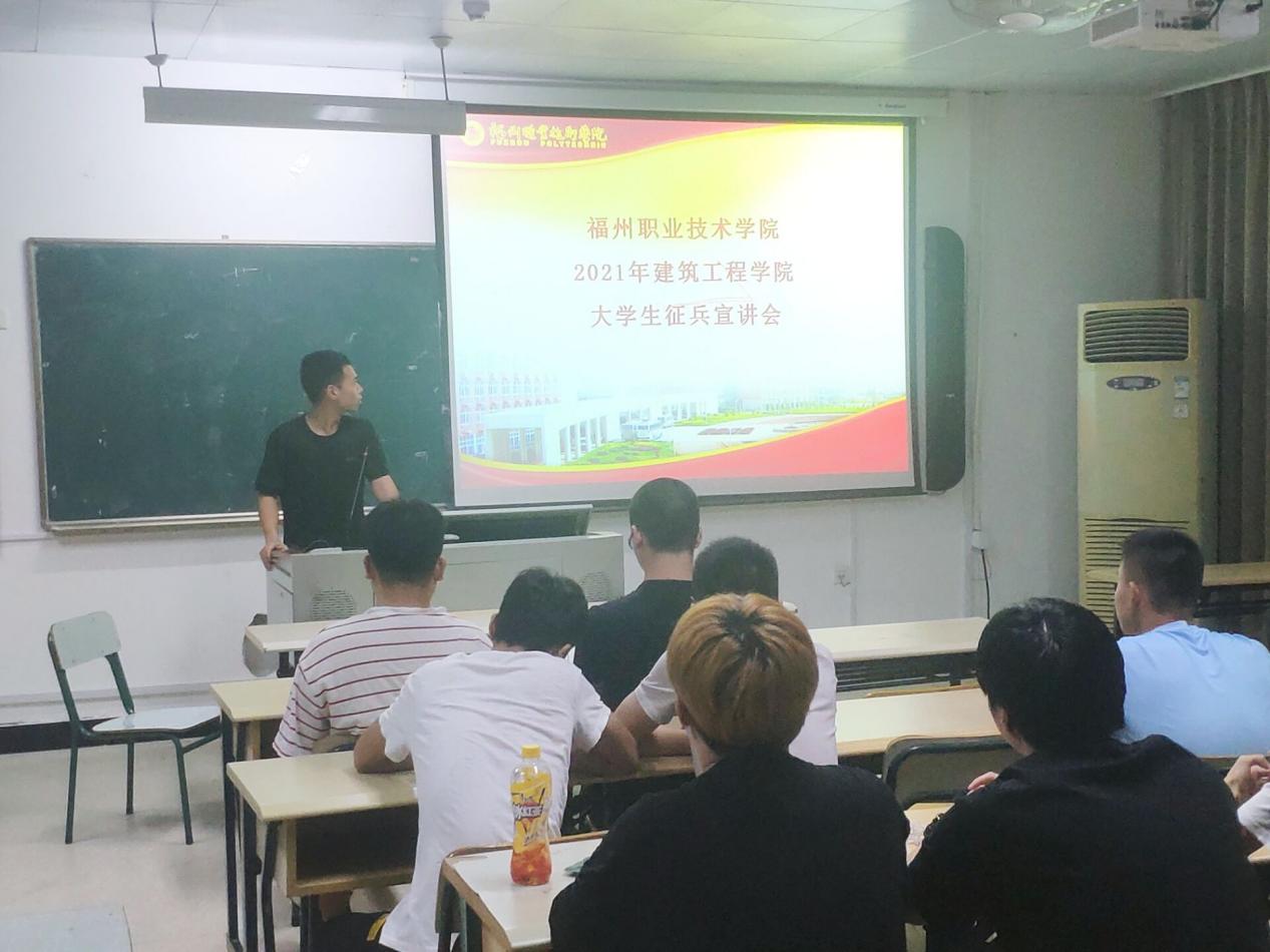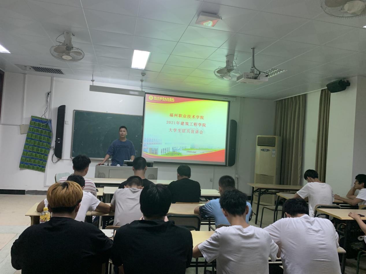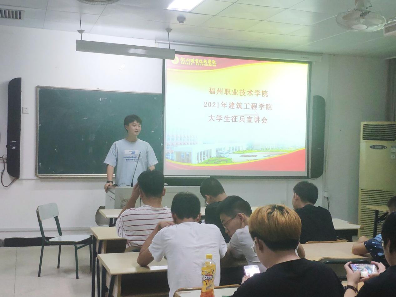 會(huì)上,首先由主持人介紹了全國(guó)整體的應(yīng)征入伍的政策,以及從政治上有優(yōu)待、學(xué)業(yè)上有照顧、工作上有出路和經(jīng)濟(jì)上有保障等方面詳細(xì)介紹了福州市閩侯縣征兵入伍的優(yōu)惠政策。接下來(lái)由3名退役士兵學(xué)生代表分別進(jìn)行了事跡宣講:造價(jià)2019-1班的邱鑫嶸介紹了退伍后的待遇等方面的知識(shí),電梯20五貫班的吳學(xué)凡講述了有關(guān)他自己從新兵連到下連隊(duì)的故事,以及造價(jià)2019-1班的張沐榕分享了自己在兵旅生活中所收獲戰(zhàn)友情的故事。