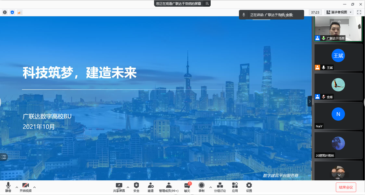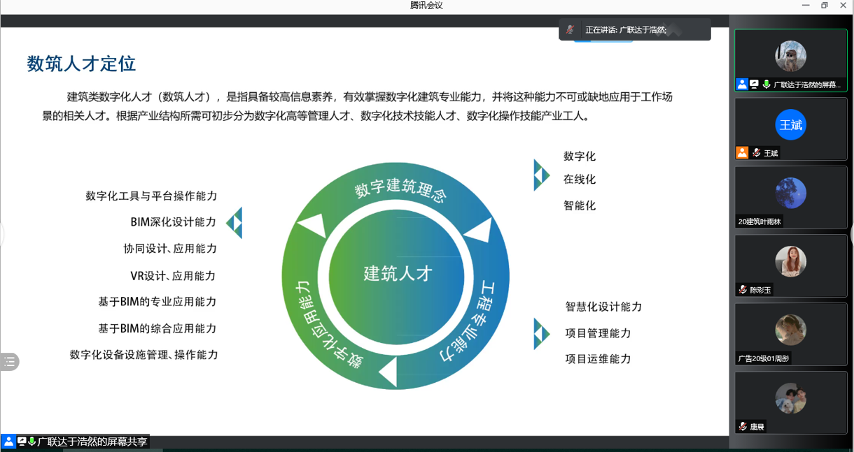 于浩然老師圍繞“科技筑夢,建造未來”主題,從建筑行業(yè)的現(xiàn)狀、經(jīng)典案例分享及就業(yè)崗位分析等方面循序漸進展開講述,幫助大家了解了在數(shù)字化、信息化大趨勢下建筑行業(yè)發(fā)展的新業(yè)態(tài)、新模式,以建筑行業(yè)新型人才需求標(biāo)準進行分析,為新時代產(chǎn)教融合模式下不同專業(yè)學(xué)生求職就業(yè)提供借鑒。