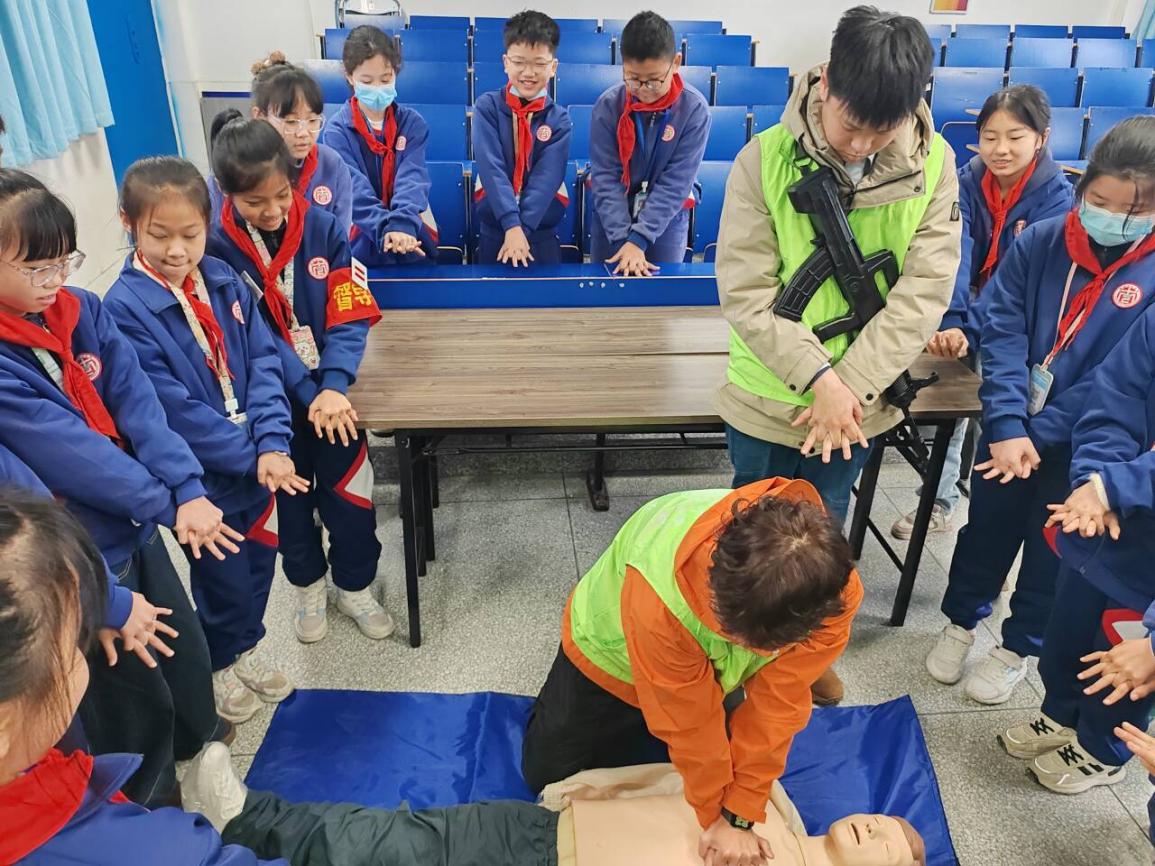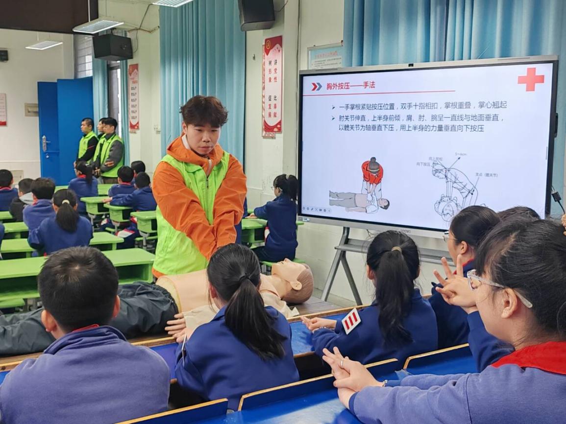 宣傳活動中,專業(yè)老師和志愿隊員們通過生動的PPT講解和實際案例分享,向學生們詳細介紹了應急救護技能的重要性。為了讓孩子們更好地掌握有關知識,專業(yè)老師和隊員們還利用模擬人進行了心肺復蘇的實操演示,并手把手指導學生進行練習,確保學生們能正確掌握操作步驟。活動現(xiàn)場氣氛活躍,學生們積極參與互動,紛紛表示學到了實用的急救技能。