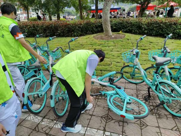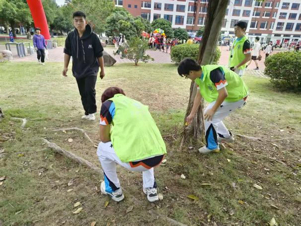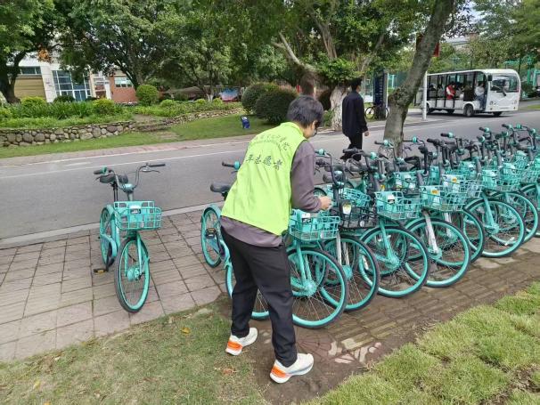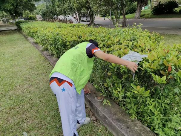 清潔行動中,身著熒光綠馬甲的志愿者分工明確:有的穿梭于綠化帶,清理灌木根部、草坪縫隙的煙頭、紙屑,不留衛(wèi)生死角;有的規(guī)整主干道、宿舍樓下的共享單車,按標(biāo)準(zhǔn)歸位;還有的志愿者對步道、樹下角落及宣傳欄開展 “地毯式清掃”,擦拭污漬。