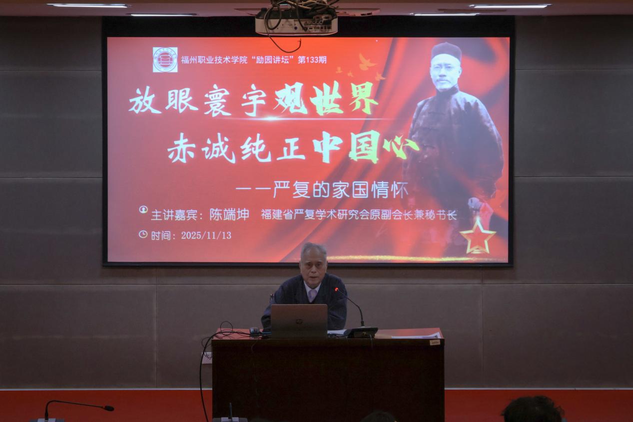 11月13日,由建筑工程學(xué)院承辦的第133期“勵(lì)園講壇”順利舉辦。本期主題是“放眼寰宇觀世界 赤誠(chéng)純正中國(guó)心——嚴(yán)復(fù)的家國(guó)情懷”,特邀福建省嚴(yán)復(fù)學(xué)術(shù)研究會(huì)原副會(huì)長(zhǎng)兼秘書(shū)長(zhǎng)陳端坤先生擔(dān)任主講嘉賓,引領(lǐng)師生共同探尋近代啟蒙思想家嚴(yán)復(fù)的精神世界。