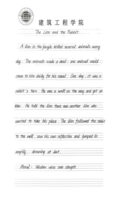 比賽中,同學(xué)們專注執(zhí)筆、工整謄寫,將6則經(jīng)典英語寓言(如《龜兔賽跑》《獅子與老鼠》等)化作筆下工整的字符。作品風(fēng)格亮點紛呈:或筆畫規(guī)范、盡顯嚴謹細致的書寫態(tài)度;或卷面整潔、流露對語言韻律的感知;或字跡流暢、傳遞寓言故事的生動氛圍。橫豎撇捺間,不僅展現(xiàn)了扎實的英語書寫功底,更讓“慢而穩(wěn)者勝”“善意終有報”等寓言哲理隨墨韻融入心間。