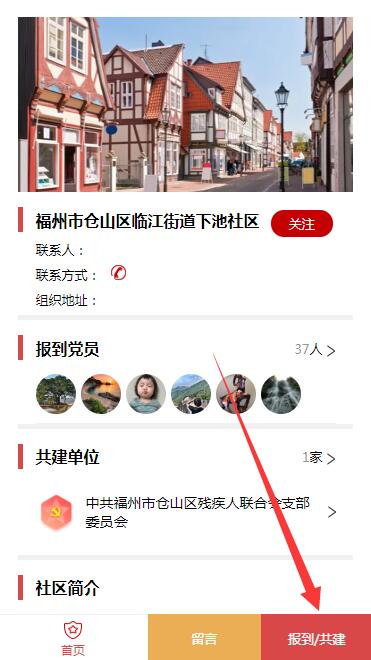 進入平臺首頁,點擊“報到”按鈕,進入社區(qū)/建制村列表,找到自己要報到的社區(qū)/建制村,進入詳情頁報到;
