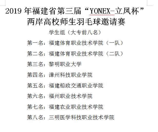 由福建省教育廳主辦,福建體育職業(yè)技術(shù)學(xué)院承辦的2019年福建省第三屆“YONEX-立鳳杯”兩岸高校師生羽毛球邀請(qǐng)賽6月2日在福建體育職業(yè)技術(shù)學(xué)院勝利閉幕。比賽匯集37所省內(nèi)及臺(tái)灣高校,60支師生隊(duì)伍,近600人參加激烈角逐。我校學(xué)生羽毛球隊(duì)在比賽中發(fā)揚(yáng)敢打敢拼、團(tuán)結(jié)協(xié)作的精神,躋身大專組六強(qiáng)。這是在校領(lǐng)導(dǎo)注重學(xué)生全面素質(zhì)發(fā)展的理念下,我校體育工作又添碩果。我們會(huì)以競賽為平臺(tái),大力發(fā)展學(xué)生體育社團(tuán)與體育第二課堂活動(dòng),推動(dòng)學(xué)校學(xué)生陽光體育運(yùn)動(dòng)開展。