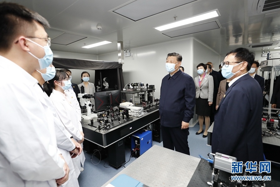 4月19日,在清華大學(xué)建校110周年校慶日即將來(lái)臨之際,中共中央總書(shū)記、國(guó)家主席、中央軍委主席習(xí)近平來(lái)到清華大學(xué)考察。這是習(xí)近平在清華大學(xué)成像與智能技術(shù)實(shí)驗(yàn)室,結(jié)合展板、電子屏幕察看實(shí)驗(yàn)室開(kāi)展計(jì)算光學(xué)、腦科學(xué)與人工智能交叉科學(xué)實(shí)驗(yàn)研究和開(kāi)發(fā)新科技應(yīng)用場(chǎng)景情況,聽(tīng)取實(shí)驗(yàn)室理論研究、技術(shù)攻關(guān)、成果轉(zhuǎn)化應(yīng)用等情況介紹。新華社記者 鞠鵬 攝