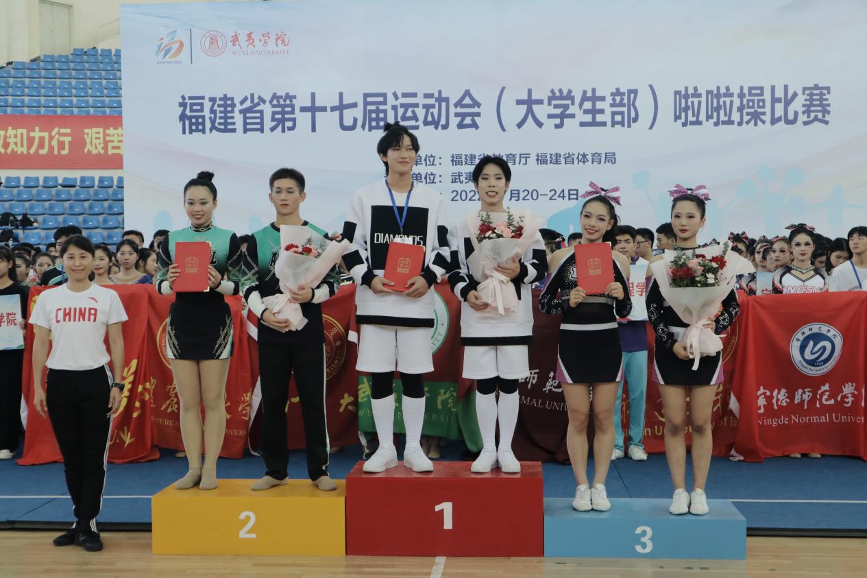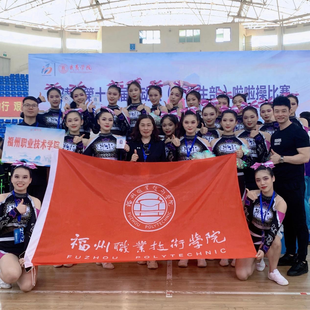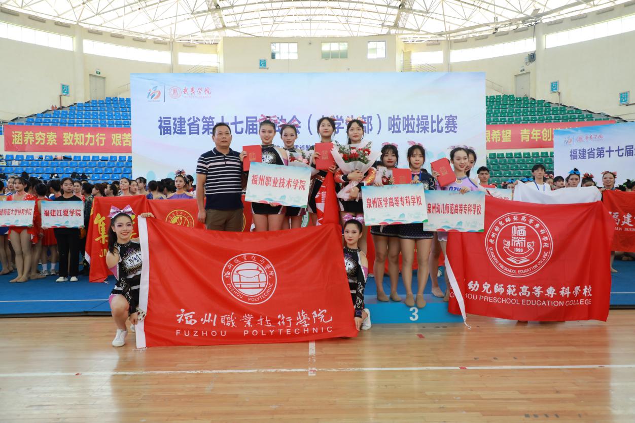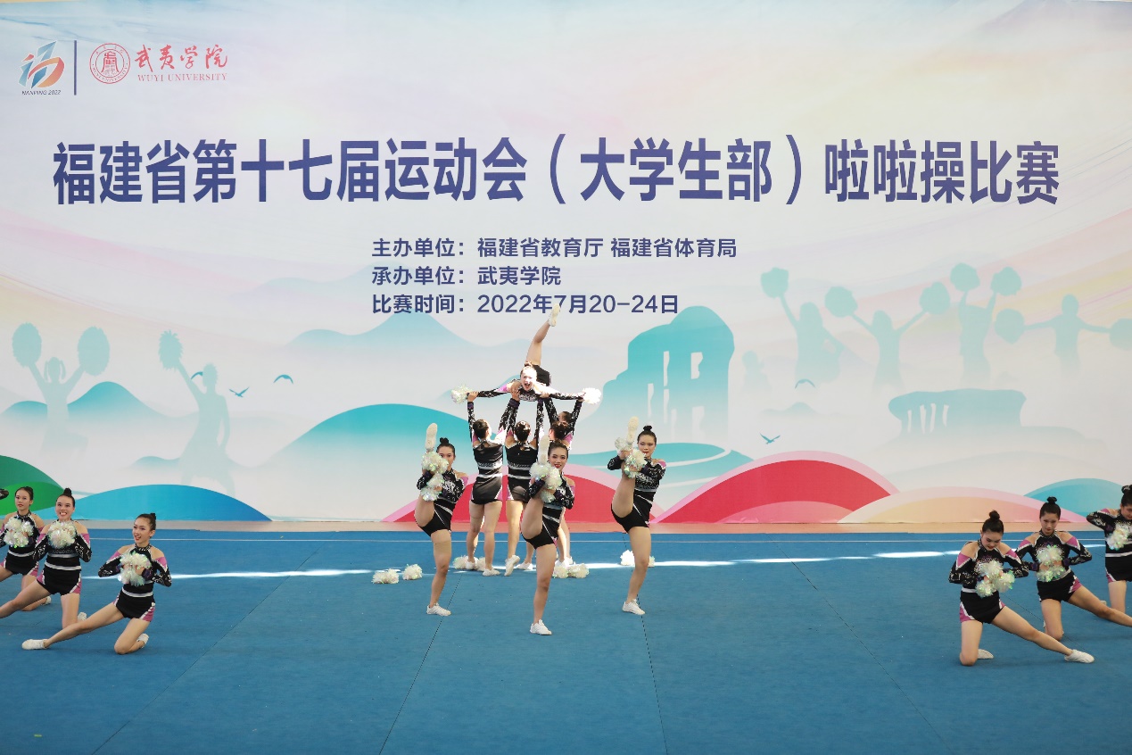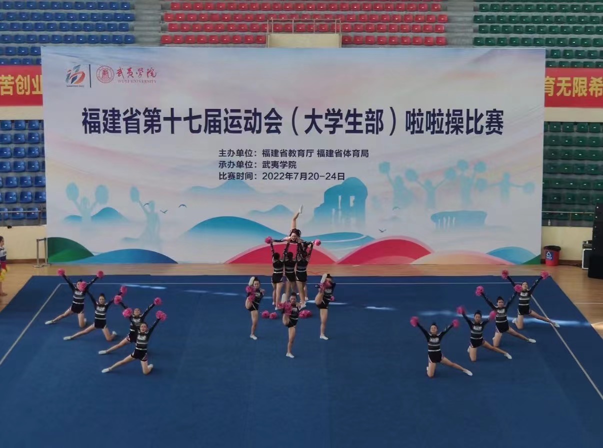 7月20日-24日,福建省第十七屆運動會(大學生部)啦啦操比賽在武夷學院如期舉行,本次比賽總共有來自38所高校的106支隊伍近1200名運動員參與。經(jīng)過激烈比拼,我校啦啦操隊獲得丙組第三套花球校園示范套路第一