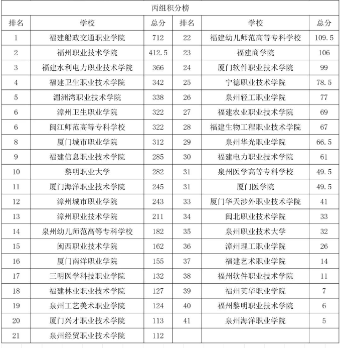 近日,福建省第十七屆運(yùn)動(dòng)會(huì)大學(xué)生部總積分出爐。本屆省運(yùn)會(huì)由福建省人民政府主辦,福建省體育局和南平市人民政府承辦,是2022年我省舉辦的規(guī)格最高、規(guī)模最大的綜合體育盛會(huì),共設(shè)置青少年部、社會(huì)俱樂(lè)部、群眾部、行業(yè)部、大學(xué)生部等5個(gè)部。其中,大學(xué)生部賽事設(shè)甲A組、甲B組、乙組、丙組四個(gè)組別,丙組共有41所高職院校參賽,我校摘得16金9銀12銅,共獲37枚獎(jiǎng)牌的優(yōu)異成績(jī),位居丙組積分榜前列,并榮獲體育道德風(fēng)尚獎(jiǎng)。具體總積分如下:
