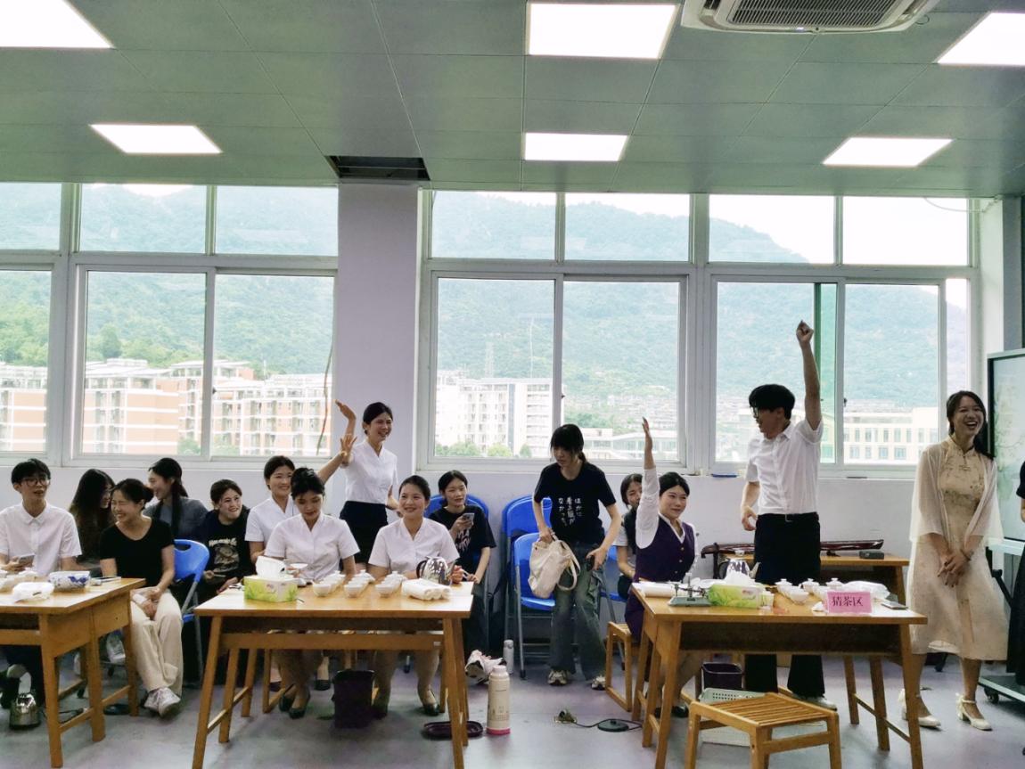 本次斗茶賽分為斗茶、猜茶、茶知識快速問答三個環(huán)節(jié)。在比賽現場,師生們運用“視覺、嗅覺、味覺、觸覺”幾個方面的感官判斷,對茶葉品質因子進行打分審評,分別選出大紅袍組、水仙組、肉桂組最受歡迎的茶王。在猜茶環(huán)節(jié),師生們通過觀外形、聞香氣、品滋味、觀湯色、觀葉底對十個茶樣進行歸類,并將正確的序號填入相應的表格中。茶文化知識快速搶答環(huán)節(jié),師生們踴躍參與,積極搶答,現場不時發(fā)出陣陣歡樂聲。在斗茶與猜茶環(huán)節(jié)之間,為了緩解現場緊張的情緒,同時也為了傳播優(yōu)秀傳統(tǒng)文化,宋玉琳老師現場演奏了古琴曲,為黃光煒同學詩朗誦《一七令》和《七碗茶詩》配樂?,F場的氛圍達到了高潮。通過此次斗茶賽,師生們不僅能夠享受到茶葉的色、香、味,還能體驗到其中的樂趣和挑戰(zhàn)性,同時也增強了對福建優(yōu)秀傳統(tǒng)文化深刻的認識。