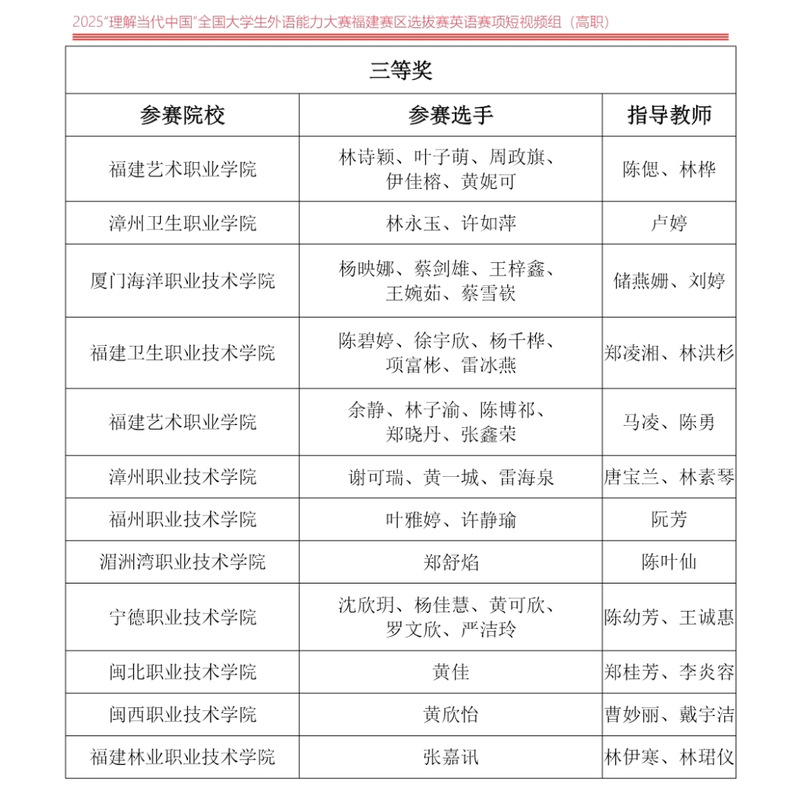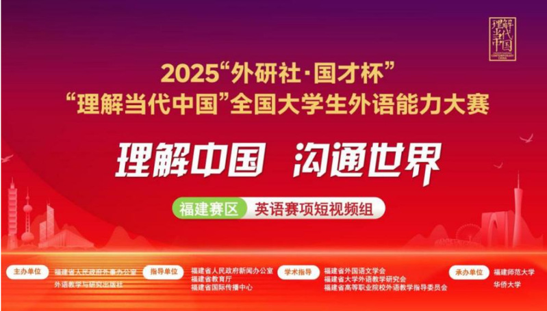 10月19日,2025年“外研社·國才杯”“理解當(dāng)代中國”全國大學(xué)生外語能力大賽福建賽區(qū)英語賽道短視頻組賽事線下評審會在華僑大學(xué)順利舉行,由通識教育學(xué)院阮芳老師指導(dǎo),24級廣告藝術(shù)設(shè)計專業(yè)學(xué)生葉雅婷、許靜瑜共同創(chuàng)作的短視頻作品脫穎而出,榮獲福建省高職組三等獎,是我院在該項賽事首次獲獎。