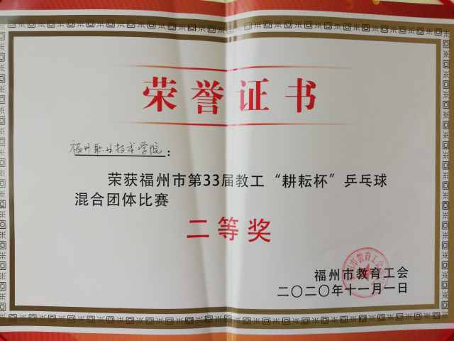 10月31日至11月1日,福州市教工第33屆“耕耘杯”乒乓球比賽在市工人文化宮舉行,此次比賽共有全市各學(xué)校的45支隊伍參賽,校工會精心組隊,認真?zhèn)鋺?zhàn),派出了由柯偉、黃燕姿、林風(fēng)人、熊小杏四位老師組成的教工乒乓球隊參賽,分別參加男單、女單、混雙比賽,四位隊員在小組預(yù)賽中一路過關(guān)斬將,以3場全勝的優(yōu)異戰(zhàn)績脫穎而出進入決賽,經(jīng)過決賽環(huán)節(jié)的激烈比拼,取得了團體二等獎的好成績。此次比賽,我校教工團結(jié)一致、奮勇爭先,展示了積極進取、敢打敢拼的精神風(fēng)貌,為學(xué)校爭得了榮譽。