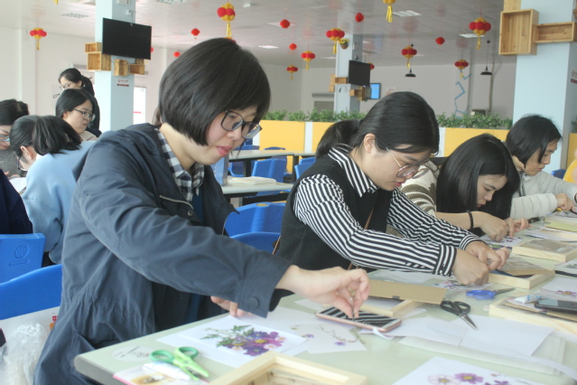 本次活動(dòng)邀請(qǐng)福州花卉苗木行業(yè)協(xié)會(huì)花藝研究會(huì)蔡璐老師為女教職工們授課,她從什么是押花藝術(shù)、押花藝術(shù)的歷史、押花藝術(shù)的特點(diǎn)、押花的制作過(guò)程等方面進(jìn)行講解。到場(chǎng)的女教職工們邊聆聽課程邊動(dòng)手操作,還相互交流創(chuàng)意,交換花材。一小時(shí)過(guò)去,大家都陸續(xù)完成了自己的押花藝術(shù)作品,現(xiàn)場(chǎng)氣氛其樂(lè)融融,十分溫馨。