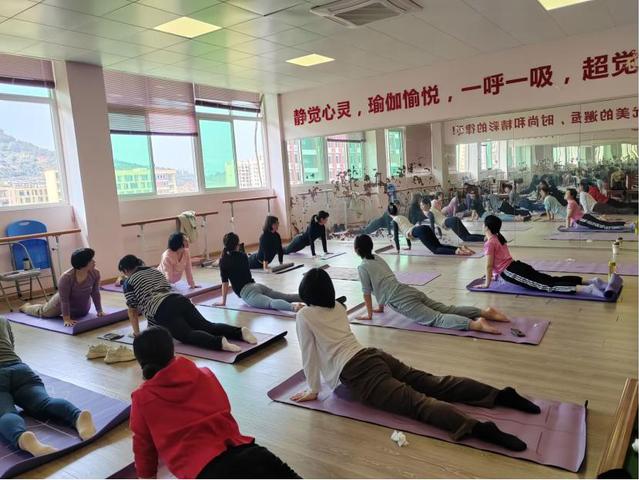 瑜伽活動現(xiàn)場,女教職工在一呼一吸里,感受歲月靜好,跟著老師的細(xì)致指導(dǎo),進(jìn)行身心放松、舒展肩頸、放空思緒、調(diào)整焦慮情緒……