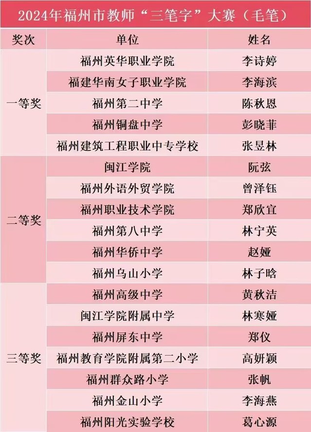 近日,福州市教育工會(huì)公布了直屬學(xué)校教師“三筆字”基本功大賽成績(jī),我校鄭欣宜老師榮獲毛筆組二等獎(jiǎng)。