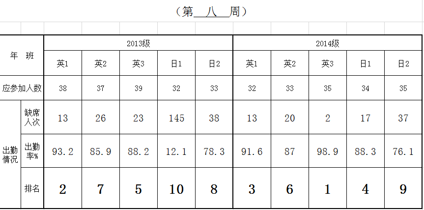 應(yīng)用外語系早讀出勤情況周統(tǒng)計表(第 八 周)