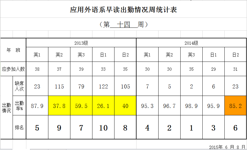 應用外語系早讀出勤情況周統(tǒng)計表(第 十四 周)