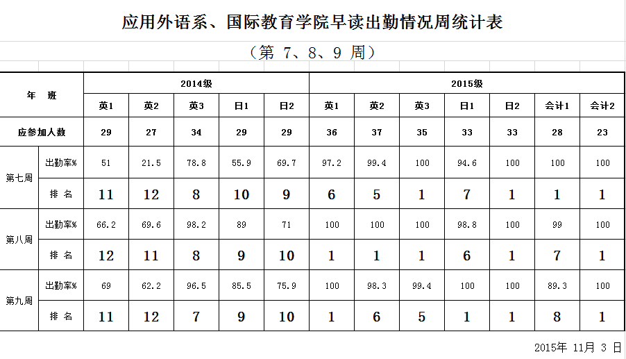 應(yīng)用外語(yǔ)系、國(guó)際教育學(xué)院早讀出勤情況周統(tǒng)計(jì)表(第 7、8、9 周)