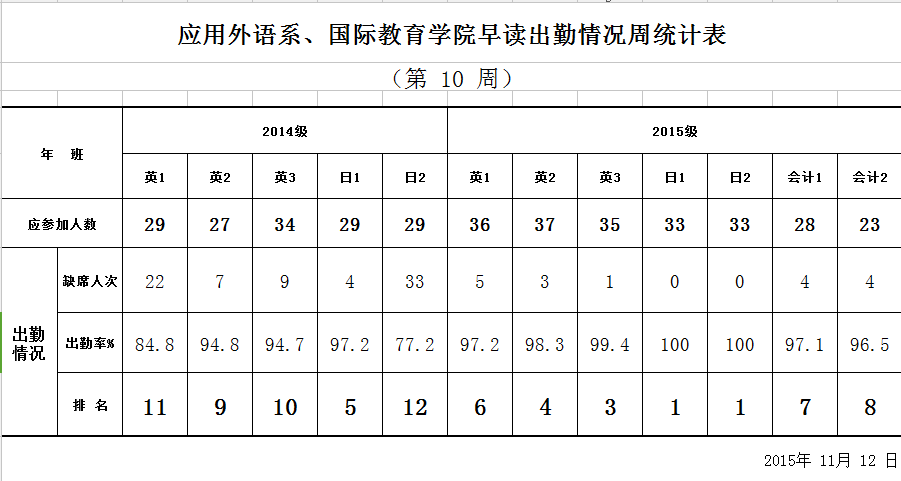 應(yīng)用外語系、國(guó)際教育學(xué)院早讀出勤情況周統(tǒng)計(jì)表(第10周)