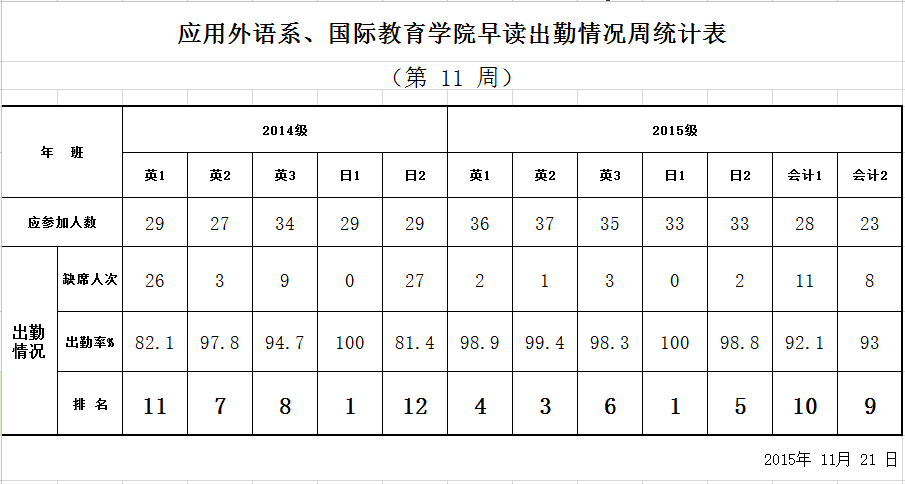 應用外語系、國際教育學院早讀出勤情況周統(tǒng)計表
