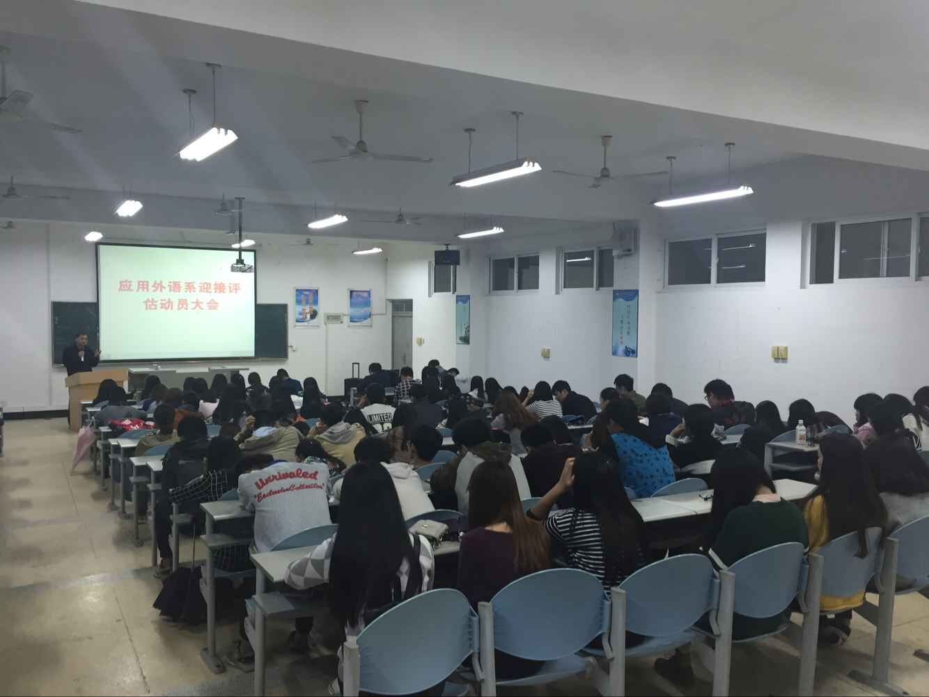 為了能夠以最好的狀態(tài)迎接評估專家的到來,應用外語系于2015年11月11日在實驗樓211多媒體教室舉行了迎接評估動員大會,啟動評估倒計時儀式。系學生兩委干部、各班班長、團支書和全體學生黨員參加了動員會。
