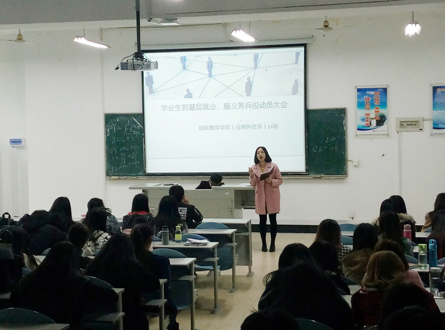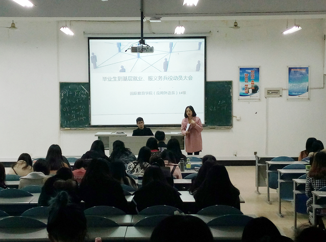 應征參軍去報國,基層就業(yè)謀發(fā)展 ——國際教育學院(應用外語系)召開基層就業(yè)暨征兵動員大會 國際教育學院(應用外語系) 2016-12-30 為引導廣大畢業(yè)生響應祖國號召、積極參軍,鼓勵畢業(yè)生基層就業(yè)。2016年12月28日,國際教育學院(應用外語系)在實驗樓211多媒體教室召開基層就業(yè)暨征兵動員大會。由學生團支部書記劉秀釵擔任此次大會主講人。14級全體學生參與此次大會。 高校畢業(yè)生是國家寶貴的人才資源。積極引導和鼓勵高校畢業(yè)生面向基層就業(yè),有利于青年人才的健康成長和改善基層人才隊伍的結(jié)構(gòu),有利于促進城鄉(xiāng)和區(qū)域經(jīng)濟的協(xié)調(diào)發(fā)展,有利于構(gòu)建社會主義和鞏固黨的執(zhí)政地位。大會上,學生團支部書記劉秀釵詳細講解了如何規(guī)劃就業(yè)方向,并鼓勵畢業(yè)生扎根基層、服務社會。同時,她也希望全體畢業(yè)生積極轉(zhuǎn)變就業(yè)觀念,先就業(yè)、后擇業(yè)。隨后,學生團支部書記劉秀釵闡述了征兵的流程以及征兵政策,促進畢業(yè)生對征兵的了解,并希望畢業(yè)生積極參軍,為祖國作貢獻。 國際教育學院(應用外語系)歷來重視鼓勵大學生參軍和基層就業(yè)工作,參軍、基層就業(yè)對大學生走向社會后的成長具有積極作用。不僅有助于學生磨礪人生,還為國防建設(shè)奉獻一份力量。 國際教育學院(應用外語系)