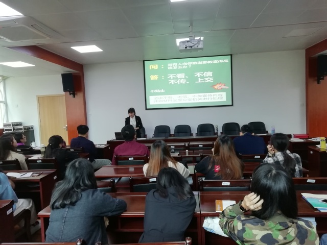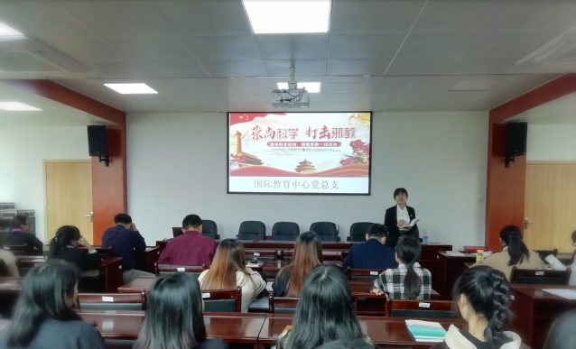 拒絕邪教,科學(xué)生活 ——國(guó)際教育中心黨總支組織反邪教黨課學(xué)習(xí)活動(dòng) 國(guó)際教育中心黨總支 2018-10-17 為大力弘揚(yáng)社會(huì)主義核心價(jià)值觀,加強(qiáng)反邪教宣傳教育,2018年10月17日,國(guó)際教育中心黨總支副書記李燕燕組織全體師生黨員及入黨積極分子在綜合樓212教室開(kāi)展以“拒絕邪教,科學(xué)生活”為主題的黨課學(xué)習(xí)活動(dòng)。 黨課上,李燕燕書記由新修訂的《中國(guó)共產(chǎn)黨紀(jì)律處分條例》新增的第六十二章對(duì)信教黨員的處理引入主題,分別從“邪教的種類”、“如何認(rèn)定邪教”、“為什么要禁止邪教”、“我們?cè)撊绾巫觥彼姆矫孢M(jìn)行講解,最后,希望全體黨員以及入黨積極分子:從我做起,拒絕邪教;崇尚科學(xué),遠(yuǎn)離邪教;勇于斗爭(zhēng),反對(duì)邪教! 通過(guò)此次黨課學(xué)習(xí)活動(dòng),全體師生黨員及入黨積極分子更加深刻認(rèn)識(shí)到邪教的本質(zhì)及危害,增強(qiáng)了識(shí)別邪教、抵制邪教的能力,進(jìn)一步營(yíng)造了熱愛(ài)科學(xué)、反對(duì)邪教的良好氛圍和育人環(huán)境。 國(guó)際教育中心黨總支 (圖文/楊彩玲)