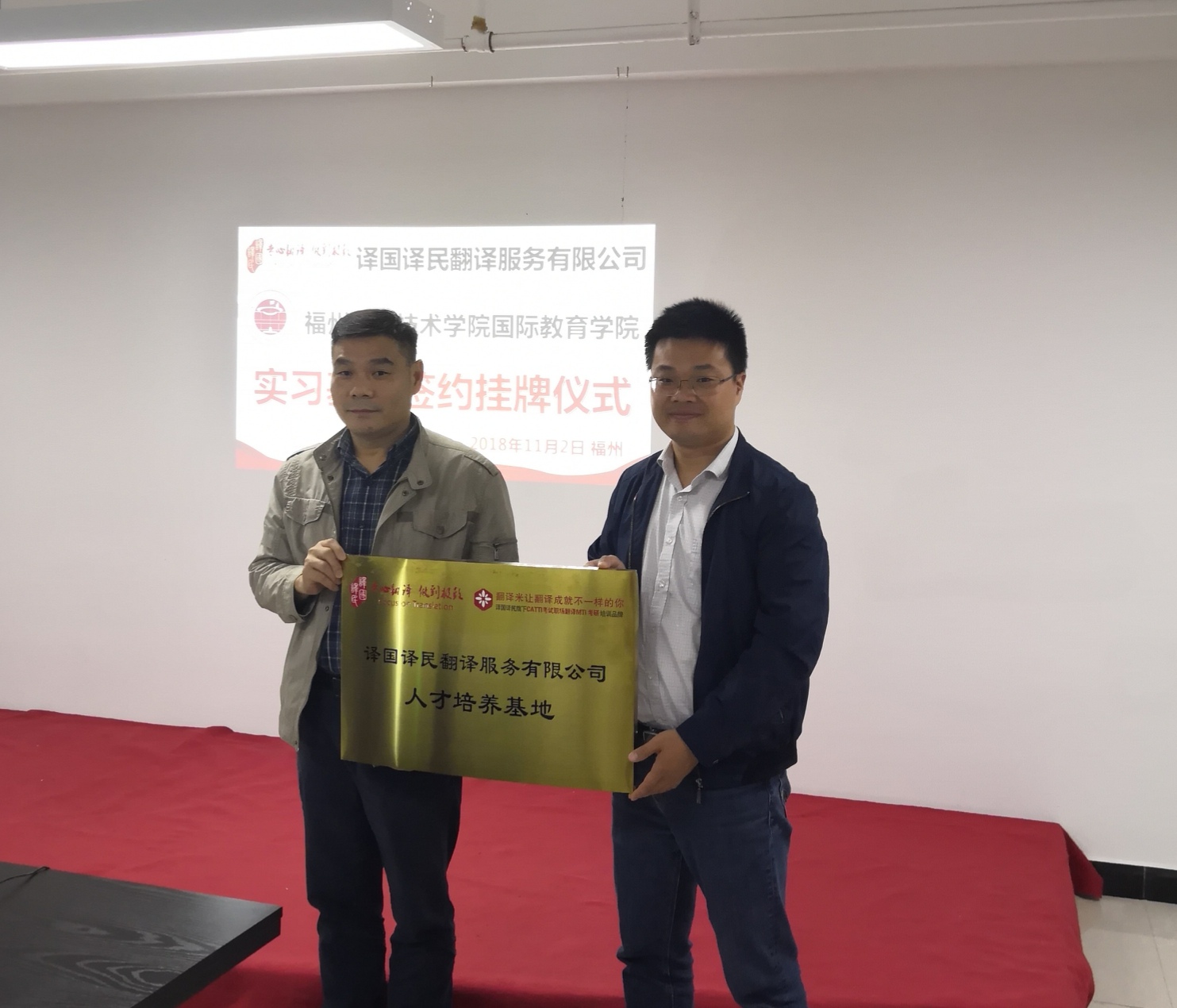 國際教育學(xué)院簽訂校外實(shí)訓(xùn)基地及人才培養(yǎng)基地協(xié)議 國際教育學(xué)院 2018-11-2 2018年11月2日,我校國際教育學(xué)院與福州譯國譯民翻譯服務(wù)有限公司的校企合作協(xié)議簽訂儀式暨人才培養(yǎng)基地掛牌儀式在福州譯國譯民有限公司會(huì)議室舉行。福州譯國譯民有限公司的董事長林世宋、高校事業(yè)部總經(jīng)理俞劍輝與國際教育學(xué)院范高明院長、商務(wù)英語專業(yè)主任阮芳以及校企合作負(fù)責(zé)教師方非與游麗琴參加了儀式。 首先,校企雙方就如何開展好校企深度合作進(jìn)行深入溝通與探討,增進(jìn)了校企合作內(nèi)涵的理解,明確了校企合作的人才培養(yǎng)項(xiàng)目內(nèi)容、產(chǎn)學(xué)研結(jié)合與產(chǎn)教成果轉(zhuǎn)換、大學(xué)生就業(yè)創(chuàng)業(yè)能力提升等方面的合作事項(xiàng),校企雙方就在發(fā)揮各自優(yōu)勢,共同致力于專業(yè)人才培養(yǎng)達(dá)成共識(shí),形成互惠互利、合作共贏的發(fā)展格局。 范高明院長表示,將充分發(fā)揮企業(yè)項(xiàng)目業(yè)務(wù)和資源優(yōu)勢,在專業(yè)人才培養(yǎng)、專業(yè)實(shí)訓(xùn)教學(xué)、學(xué)術(shù)研究等方面做出成效,以企業(yè)實(shí)際生產(chǎn)為依托,以技術(shù)研發(fā)為支持,形成校企合作特色。而林世宋董事長表示將大力支持校企合作建設(shè),支持師資頂崗鍛煉工作,共同培養(yǎng)企業(yè)需要的專業(yè)技術(shù)技能人才,并對(duì)深化校企合作充滿信心和期待。 最后,校企雙方代表范高明院長與林世宋董事長簽署了校外實(shí)訓(xùn)基地協(xié)議,福州譯國譯民翻譯服務(wù)有限公司董事長林世宋授予國際教育學(xué)院“人才培養(yǎng)基地”牌匾。按照協(xié)議框架,雙方將在協(xié)同創(chuàng)新、人才培養(yǎng)等領(lǐng)域,建立長期的產(chǎn)學(xué)研戰(zhàn)略合作關(guān)系,開展廣泛深入的合作與交流。 校企合作培養(yǎng)企業(yè)適用人才,起著至關(guān)重要的作用。此次簽約標(biāo)志著國際教育學(xué)院在校企合作、聯(lián)合培養(yǎng)人才方面上了新的臺(tái)階。 (圖文/方非)