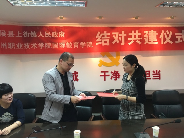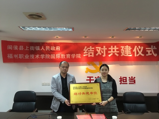 為進(jìn)一步激發(fā)學(xué)院黨團(tuán)工作活力,深入推進(jìn)學(xué)院社會(huì)服務(wù)工作,20181130日,國際教育學(xué)院與閩侯縣上街鎮(zhèn)人民政府開展合作共建活動(dòng),上街綜治辦葉主任與國際教育學(xué)院學(xué)生黨支部書記黃燕姿、團(tuán)總支書記劉秀釵共同簽訂了《結(jié)對共建協(xié)議書》。