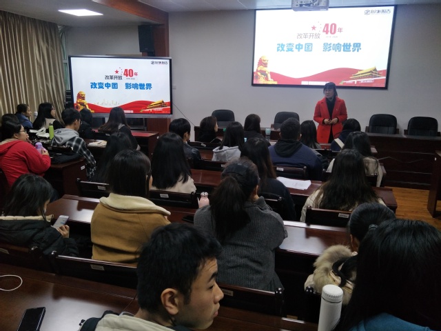 改變中國 影響世界 國際教育學院 2019-01-03 為慶祝改革開放40周年,引導學生進一步堅定理想信念,2019年1月3日,國際教育學院在綜合樓212教室召開改革開放專題黨課。由黨總支副書記李燕燕給學生們上了一堂生動的黨課。 黨課上,李燕燕副書記通過改革開放的偉大歷程、具體措施、主要成就、重大意義、改革開放的經(jīng)驗和展望等方面講述了幾代國家領導人帶領全國人民堅定不移地開辟中國特色社會主義道路,不忘初心,砥礪前行,使黨的面貌、國家的面貌、民族的面貌、人民的面貌發(fā)生了翻天覆地的變化,經(jīng)濟社會全面發(fā)展,國際地位不斷提升,人民生活水平顯著提高。課后,學生們紛紛表示要以習近平新時代中國特色社會主義思想和黨的十九大精神為指導,認真學習,為祖國貢獻一份力量。 作為新時代的青年,應要在繼承中發(fā)展,在發(fā)展中繼承,堅持黨的領導,堅持改革開放,不斷提出新思路新見解,為實現(xiàn)中華民族偉大復興而努力奮斗。 國際教育學院 (圖文/聶鳳琴)