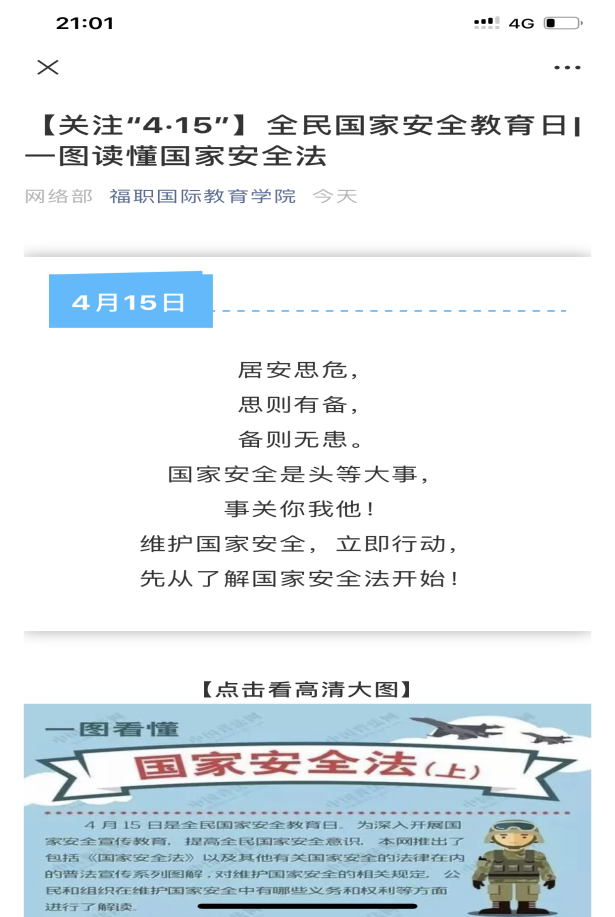2020415日是我國第五個“全民國家安全教育日”,增強國家安全意識,提高風(fēng)險防范能力,國際教育學(xué)院414日起,在我院全體師生中開展國家安全線上宣傳教育活動。