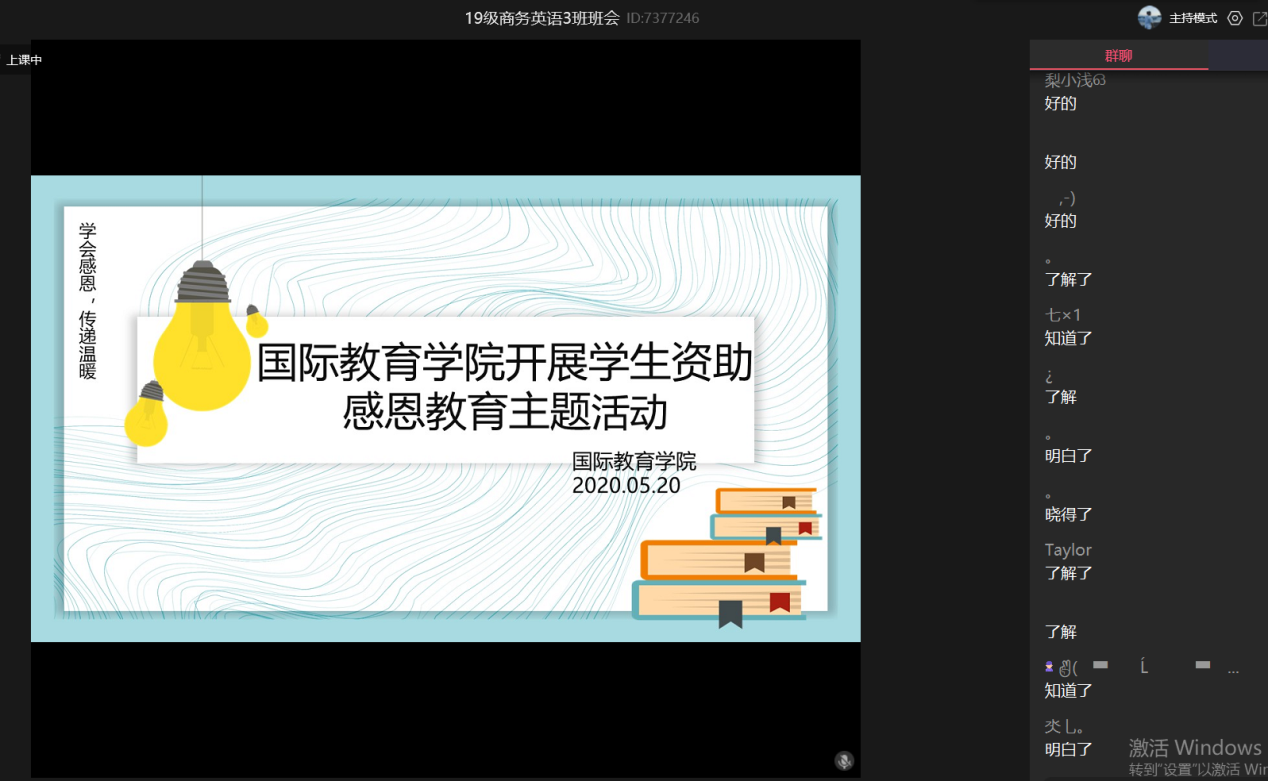 為進(jìn)一步提高學(xué)生感恩意識(shí),發(fā)揮學(xué)生資助工作的助學(xué)和育人功能,2020年5月20日,國(guó)際教育學(xué)院開展線上學(xué)生資助感恩教育主題活動(dòng),由輔導(dǎo)員嚴(yán)昕老師主持,全體學(xué)生參加。 活動(dòng)中,嚴(yán)昕老師通過分享志愿服務(wù)典型人物及我院先進(jìn)學(xué)生代表事跡,闡釋了常懷感恩之心在大學(xué)生成長(zhǎng)成才過程中的重要性。通過線上問答、發(fā)表感言等方式,同學(xué)們?cè)诨顒?dòng)中不斷強(qiáng)化服務(wù)和奉獻(xiàn)意識(shí)。最后,嚴(yán)昕老師寄語(yǔ)大家要常懷感恩之心,從身邊小事做起,感恩家人、感恩學(xué)校、感恩社會(huì)。 通過本次活動(dòng),學(xué)生進(jìn)一步加深了對(duì)感恩的理解與認(rèn)識(shí),同學(xué)們紛紛表示會(huì)將活動(dòng)中收獲的感悟融入到學(xué)習(xí)和生活中,努力培養(yǎng)感恩、奮進(jìn)的優(yōu)秀品格。 國(guó)際教育學(xué)院 (圖文/簡(jiǎn)婧婧)