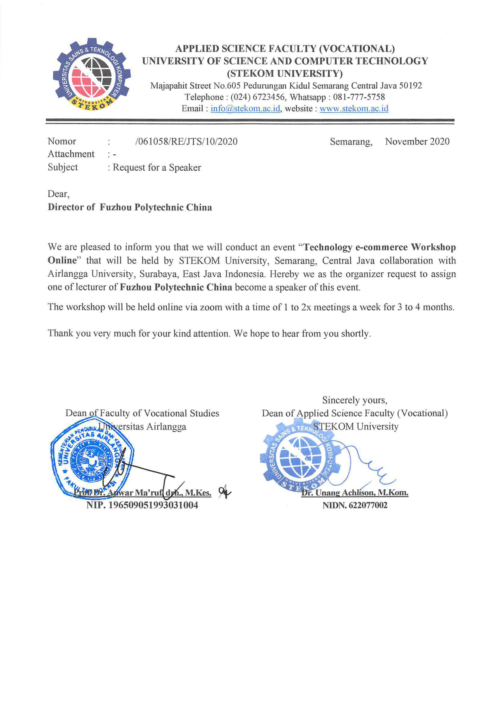 2020年12月8-18日,我校應(yīng)印尼STEKOM大學(xué)和AIRLANGA大學(xué)的邀請(qǐng),開展“中印尼電子商務(wù)專業(yè)技術(shù)培訓(xùn)”項(xiàng)目活動(dòng)。我校國(guó)際教育學(xué)院、商學(xué)院和阿里巴巴大數(shù)據(jù)學(xué)院聯(lián)合承辦本次培訓(xùn),選派了8名電子商務(wù)專業(yè)和大數(shù)據(jù)應(yīng)用技術(shù)專業(yè)聯(lián)合國(guó)際教育學(xué)院英語(yǔ)翻譯的優(yōu)秀教師,通過Zoom、YouTube等線上授課平臺(tái)為700名印尼師生開展了為期兩周的中、英、印尼語(yǔ)三語(yǔ)同步的電子商務(wù)技術(shù)培訓(xùn)。培訓(xùn)從電子商務(wù)的發(fā)展歷程到信息時(shí)代大數(shù)據(jù)應(yīng)用給商務(wù)帶來的變革,從自媒體經(jīng)濟(jì)的迅猛發(fā)展到智慧物流的助推作用,從整合營(yíng)銷思維到全產(chǎn)業(yè)鏈的構(gòu)建,為印尼兩所高校的師生帶來了全新理念、前沿技術(shù)、社會(huì)進(jìn)步的培訓(xùn)。培訓(xùn)中,印尼師生還與我校授課教師開展了深入的探論,促進(jìn)了兩國(guó)師生的互通,增進(jìn)了解。此次培訓(xùn)為我校與印尼高校的未來開展職業(yè)教育國(guó)際合作進(jìn)一步奠定了堅(jiān)實(shí)的基礎(chǔ)。 我校踐行“一帶一路”國(guó)家倡議,根據(jù)合作目的國(guó)的要求,開展技術(shù)服務(wù)。技術(shù)服務(wù)作為職業(yè)教育對(duì)外開放的一次舉措,充分發(fā)揮雙高計(jì)劃”院校職業(yè)教育國(guó)際合作與交流的積極作用,為提升我校國(guó)際影響力和知名度續(xù)寫篇章。 (國(guó)際教育學(xué)院 嚴(yán)欽文/圖) 2020年12月22日