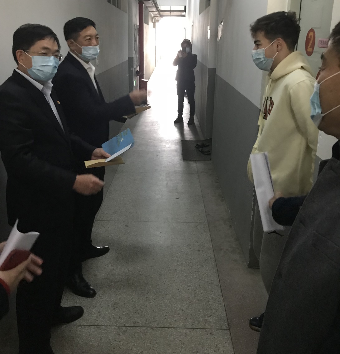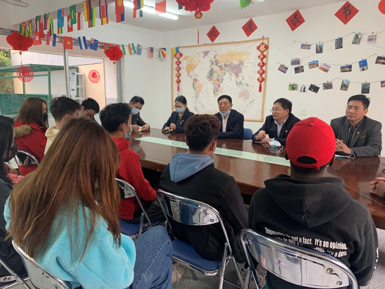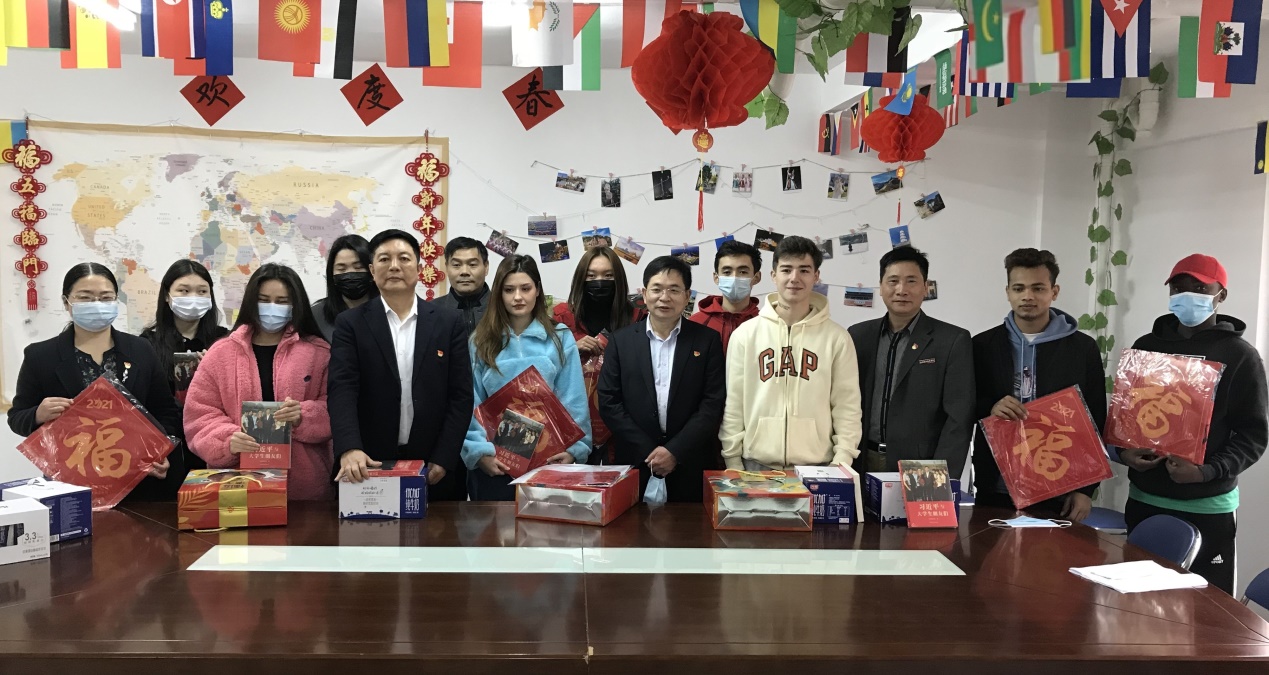 心系國際生,禮傳勵園情 ——校領(lǐng)導(dǎo)慰問留校國際學生 2月9日下午,學校領(lǐng)導(dǎo)林子波書記、李秋斌校長、劉松林副校長、劉春蘭副校長,在黨工部部長包良燁、學生處處長夏勇和國際教育學院院長范高明等部門領(lǐng)導(dǎo)的陪同下,前往國際學生公寓看望并慰問寒假期間留校的9名國際學生,向同學們致以新春佳節(jié)問候,為同學們送上新春祝福和吉祥禮包。 留校的9名國際學生是在新冠疫情后第二年在中國歡度新春佳節(jié)。春節(jié)前夕,林子波書記、李秋斌校長等領(lǐng)導(dǎo)深入國際學生公寓,向國際學生虛寒問暖,關(guān)心他們的寒假生活。之后,校領(lǐng)導(dǎo)與國際學生在國際生活動室召開了座談會,了解國際學生寒假在校的學習和生活情況,對國際學生漢語水平提高和要求升本的好學態(tài)度表示欣慰。林書記代表校領(lǐng)導(dǎo)為國際學生過好寒假和春節(jié)作出指導(dǎo)和要求,鼓勵國際學生利用好學校的各類學習設(shè)備和生活設(shè)施,假期堅持學習、開心生活;注意疫情防控工作,克服困難并多咨詢疑問,堅持鍛煉身體、保持身心健康;到當?shù)馗V菔袇^(qū)體驗春節(jié)傳統(tǒng)習俗,感受中國年味,通過網(wǎng)絡(luò)訊息與家人互通聯(lián)系,讓遠在異國家鄉(xiāng)的父母朋友放心;隨后對國際學生提出殷切希望和新春祝福。同時,校領(lǐng)導(dǎo)也向在一線值班的老師和工作人員表示感謝和春節(jié)祝福。 國際學生們用流利的漢語表達了學校的溫暖和愛護的謝意,表示雖然遠離異國他鄉(xiāng),能習慣和喜愛中國福州的生活和環(huán)境,在學校領(lǐng)導(dǎo)和老師的關(guān)心和支持下,把學習和生活安排地充實,學有所成;同時,國際學生代表阿里親手制作的新春賀卡敬獻給校領(lǐng)導(dǎo),表達了對校領(lǐng)導(dǎo)新春祝福。 接著,幾位校領(lǐng)導(dǎo)向國際學生送上年貨禮包的物質(zhì)食糧、《習近平與大學生朋友們》和春聯(lián)福包的精神食糧,并與國際學生合影留念。 通過這次新春慰問活動,進一步了解國際學生的學習和生活情況,加深了師生的深厚感情,增進了與各國國際學生的友誼,也進一步促進了國際學生對中國新春佳節(jié)傳統(tǒng)節(jié)日文化的了解。