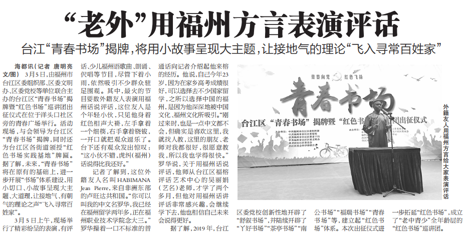 35,我校盧旺達(dá)籍國(guó)際學(xué)生HABIMANA JEAN PIERRE(羅華)應(yīng)邀在臺(tái)江區(qū)“青春書場(chǎng)”揭牌暨“紅色書場(chǎng)”巡講團(tuán)出征儀式表演福州評(píng)話,出色的表演引來群眾陣陣好評(píng)。表演結(jié)束后,海峽都市報(bào)記者還專門采訪了該生,HABIMANA JEAN PIERRE(羅華)用流利的中文介紹了在福州職業(yè)技術(shù)學(xué)院學(xué)習(xí)福州評(píng)話的經(jīng)歷,表達(dá)了對(duì)中文文化的喜愛,并對(duì)學(xué)校老師們的辛勤培育表示感謝。