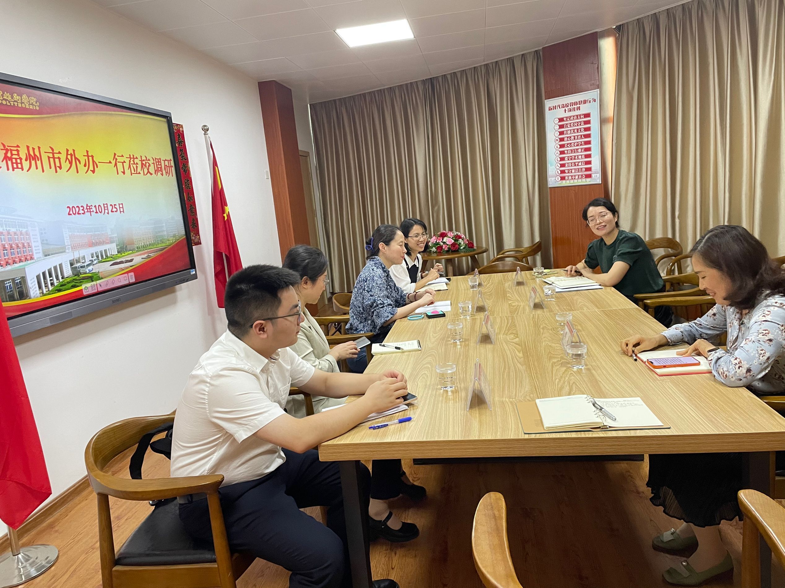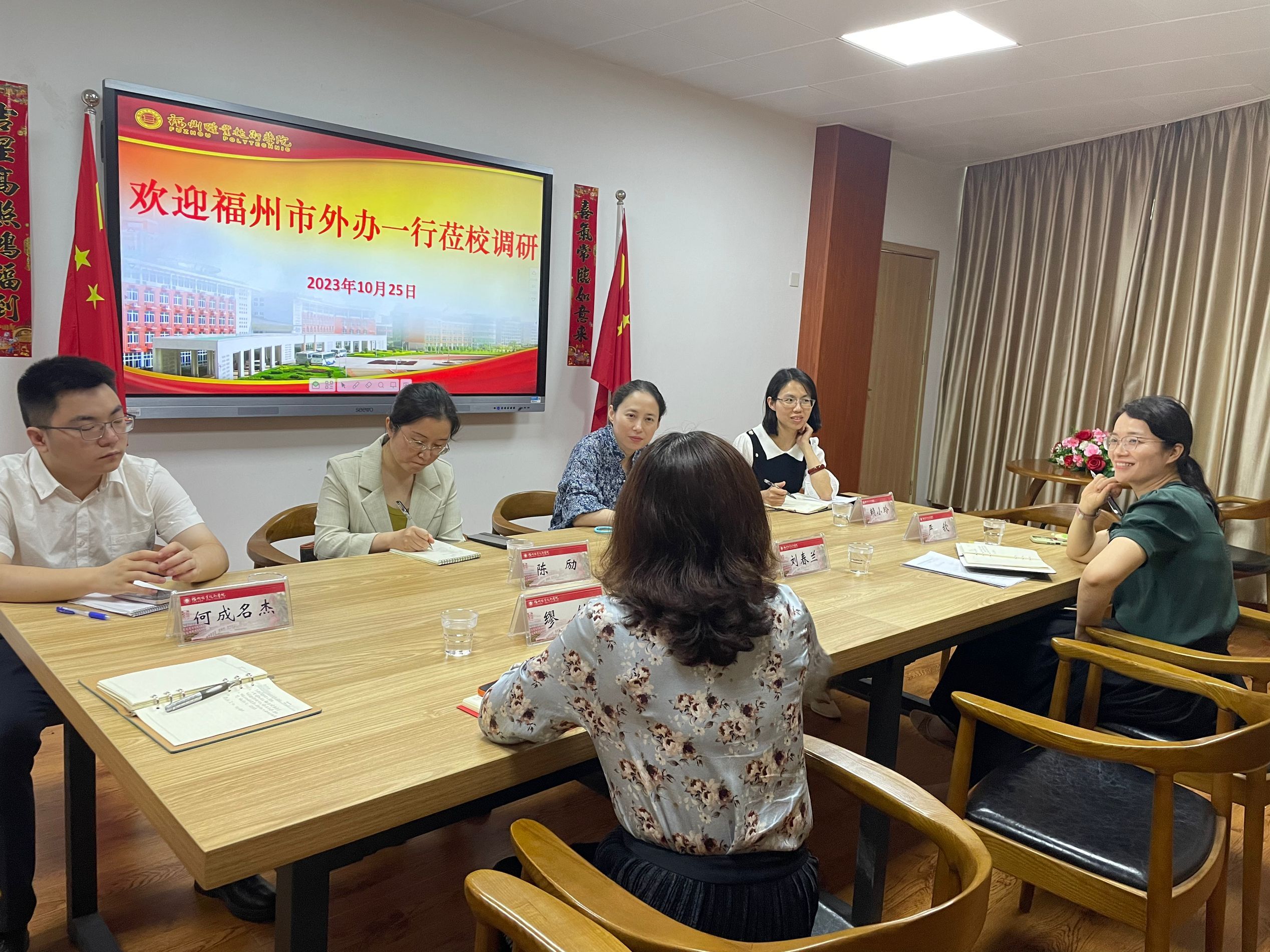 福州市外辦副主任張薇一行蒞臨我校調(diào)研 10月25日下午,福州市外辦副主任張薇帶領(lǐng)外事翻譯中心副主任賴小玲等一行4人蒞臨我校調(diào)研。學校公共教育部、國際教育中心負責人及相關(guān)人員參加座談會。 會上,雙方圍繞聯(lián)合培養(yǎng)外事翻譯人才及國際生招收與培養(yǎng)情況展開深入交流。張薇副主任對我校職業(yè)外語教師和國際生的招收與培養(yǎng)情況予以肯定。 今后,學校將繼續(xù)與福州市外辦攜手,資源共享,共同推動我校國際交流合作發(fā)展。 (圖/文 國際教育中心陳雅珍)