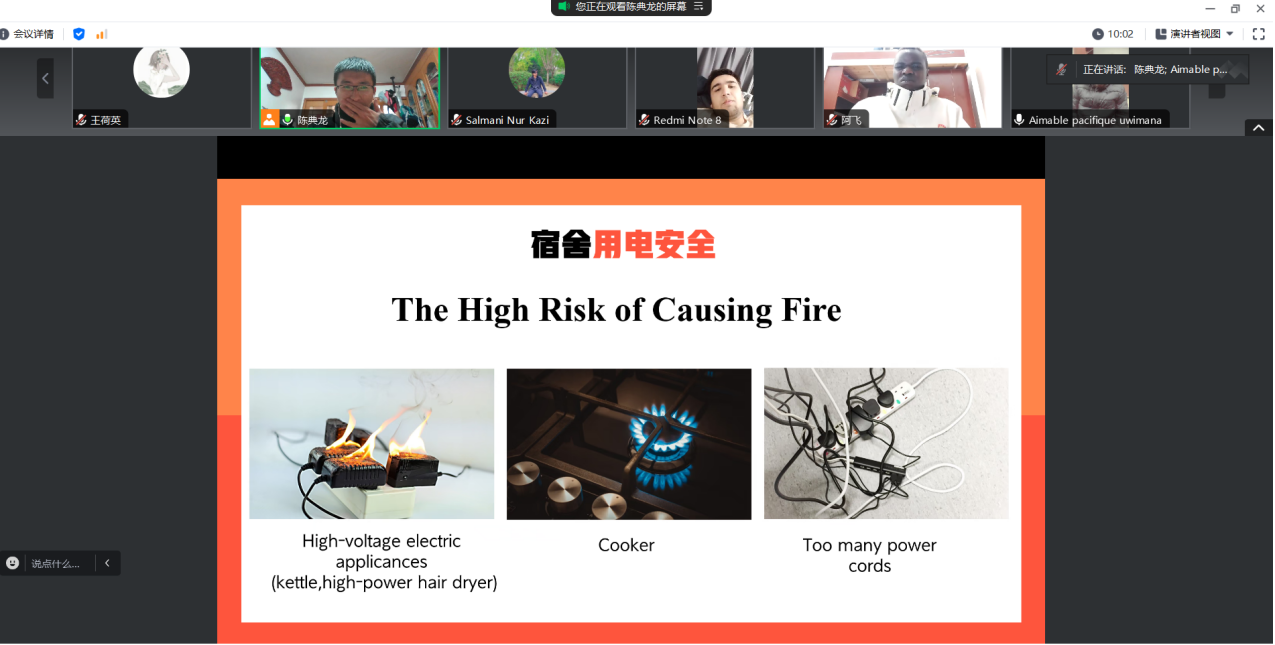會上,陳典龍詳細講解了學校有關(guān)的規(guī)章制度,結(jié)合常見的宿舍安全事故,列舉了寢室的主要安全隱患,如使用違規(guī)電器、吸煙、劣質(zhì)排插、打火機、酒精飲品等,他要求在校國際學生在假期期間要嚴格遵守寢室安全規(guī)定,注意用電安全,嚴防發(fā)生宿舍火災(zāi)。為迅速應(yīng)對突發(fā)的情況,他整理并公布了值班教師、校園安全應(yīng)急聯(lián)系人通訊錄,要求國際學生發(fā)現(xiàn)緊急情況后,及時報告,確保學校在第一時間妥善處置。此外,他還就防詐騙、禁毒、非法就業(yè)、交通安全、居留證件等知識對國際學生進行宣傳和教育。