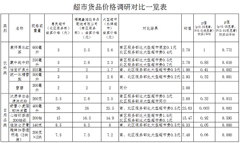 本次調(diào)研采取抽樣調(diào)查的形式,從學院的兩家超市中隨機抽取飲料類、日用品類、速食類三類貨品進行價格調(diào)查(每類商品抽取5種物品)。從學生干部各調(diào)研小組獲取的相關貨品的價格比對,總體來看,部分貨品價格略比永輝超市高些,價格在0.1-1.6元/件,部分與永輝超市同價,少部分貨品略低于永輝超市。 又經(jīng)過數(shù)據(jù)統(tǒng)計軟件SPSS19.0,統(tǒng)計分析,在15件調(diào)查貨品中,只有一件商品的P<0.03達到顯著水平,說明該商品價格略高于校外。