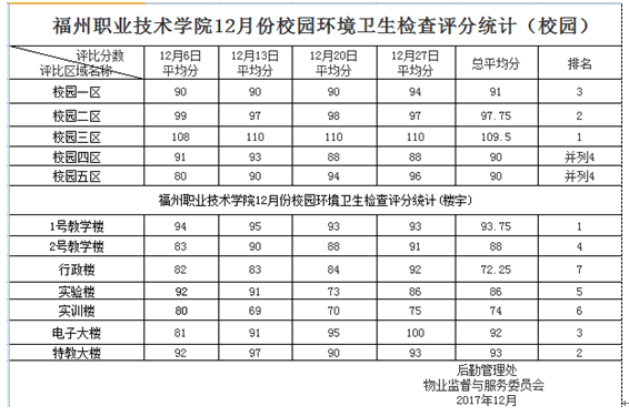 本著公平、公正的原則,根據(jù)《福州職業(yè)技術(shù)學(xué)院校園環(huán)境衛(wèi)生管理及評比辦法》現(xiàn)將12月份校園環(huán)境衛(wèi)生評比結(jié)果情況公示如下: