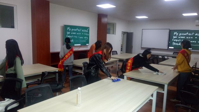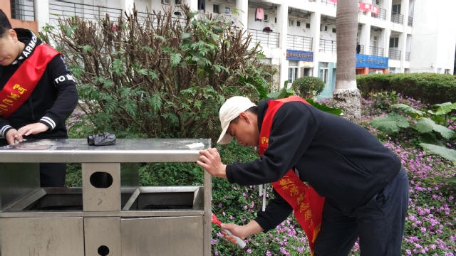 活動前期積極開展宣傳工作,通過海報(bào)、展板、網(wǎng)絡(luò)在校內(nèi)進(jìn)行宣傳,重點(diǎn)宣傳活動的目的、流程和意義,使志愿者們普遍了解此次活動,提高本次活動的參與度?;顒臃譃?span lang="EN-US">5項(xiàng),分別為:校園內(nèi)主干道、人行道、綠化帶等垃圾清撿活動;“校園牛皮癬日日清”清除校園小廣告活動;“重塑課桌文明”清掃課桌活動; “文明標(biāo)識引你看”校園標(biāo)識、雕塑清掃活動;“握在手心里的溫暖”樓梯扶手清潔活動。根據(jù)事先安排,每項(xiàng)活動由專人負(fù)責(zé),集中活動時(shí)間為中午、傍晚及周末。