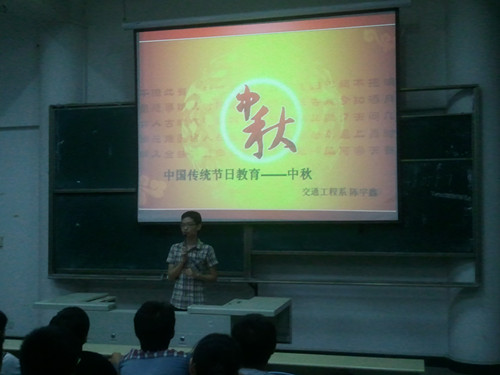自2008年起,中國(guó)傳統(tǒng)節(jié)日中秋節(jié)被列為國(guó)家新增法定假日?!昂I仙髟?,天涯共此時(shí)”,中秋節(jié)民俗已深入人心,中秋節(jié)既凝聚了豐富的中華文化傳統(tǒng),也是親人團(tuán)聚的日子。?xml:namespace> 交通工程系于2013年9月16日晚,在1號(hào)教學(xué)樓501教室開(kāi)展中秋佳節(jié)會(huì)。會(huì)上開(kāi)展了介紹環(huán)節(jié),讓同學(xué)們認(rèn)識(shí)中秋節(jié)的來(lái)歷和意義;開(kāi)展了問(wèn)答環(huán)節(jié),讓同學(xué)們?cè)谟腥さ牟聼糁i活動(dòng)和搶答氛圍中,了解了中國(guó)傳統(tǒng)節(jié)日的形式多樣和豐富內(nèi)容。同時(shí),我系通過(guò)宣傳欄、主題活動(dòng)、祝福短信等豐富多彩的形式,精心設(shè)計(jì)內(nèi)容,廣泛宣傳傳統(tǒng)節(jié)日,營(yíng)造出了濃厚的民族節(jié)日氛圍,以此弘揚(yáng)民族精神和傳統(tǒng)文化。 此次會(huì)議使學(xué)生了解傳統(tǒng)佳節(jié)-中秋文化。使我系學(xué)生更多地了解中華民族傳統(tǒng)節(jié)日的文化內(nèi)涵,讓同學(xué)們懂得人類優(yōu)秀文化的共性和追求美好生活的共同信念,培養(yǎng)了同學(xué)們的愛(ài)國(guó)主義情感。